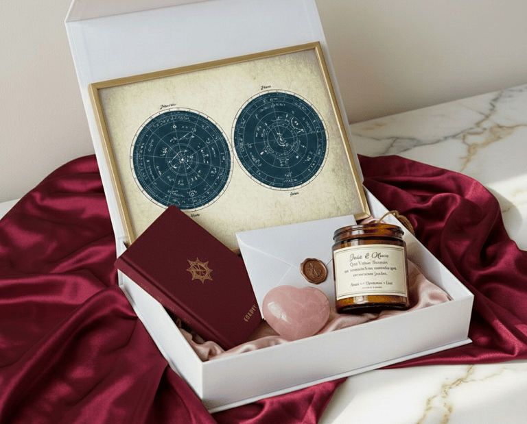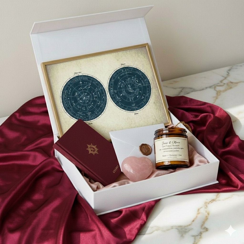 Esqueça os eletrodomésticos. Ofereça aos noivos a Sinastria do Casal encadernada num livro de luxo. Uma análise profunda sobre o encontro das suas duas almas, os seus propósitos conjuntos e a magia da sua união. O presente que eles vão guardar para sempre.