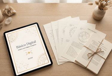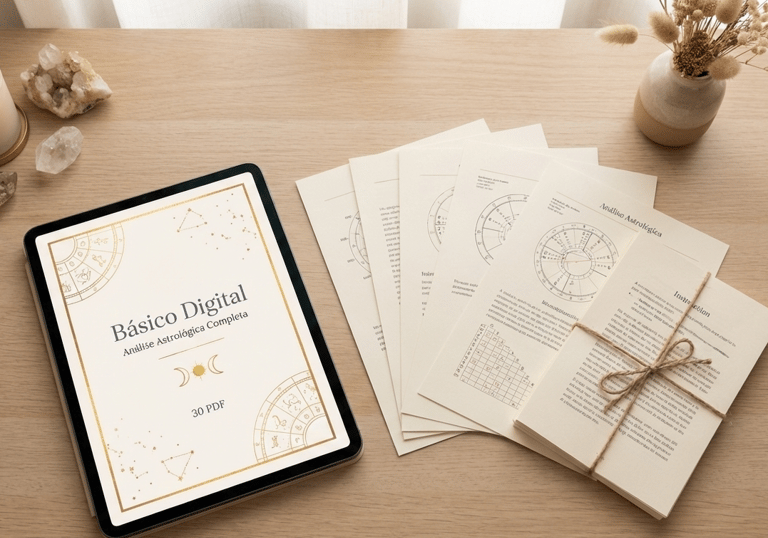 A análise astrológica completa num ficheiro PDF elegante, com cerca de 50-60 páginas. Paginação cuidada, pronta para ler no tablet ou imprimir. Inclui a análise da tua personalidade, desafios e potenciais.