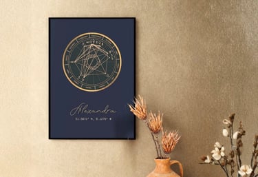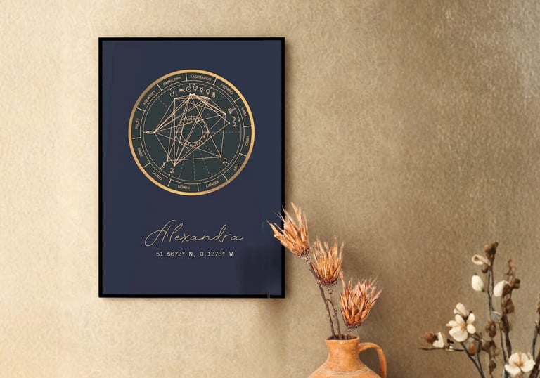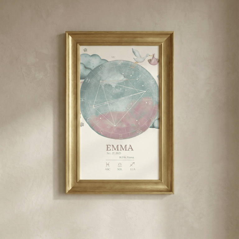 A geometria sagrada do teu nascimento. Recebes o desenho do teu Mapa Astral em alta resolução (PDF), perfeito para imprimires e emoldurares. Uma peça de arte minimalista e eterna.