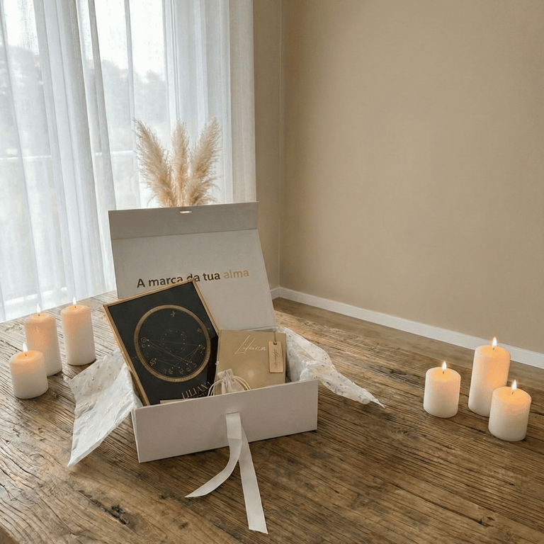 Inclui: Livro da tribo familiar, ilustração da árvore "genealógica" - A3, vela de cera de soja (energia união), um candeeiro de sal dos Himalaias, jogo de dados astrológicos personalizados para esta família, entre outros.